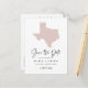 Meddela din bröllop-dejt till familj och vänner med det här Texas statliga temat spara datum meddelande vykort. Den illustrerar Texas tillstånd, enkel typografi och handskript. Anpassa genom att lägga till namn, datum, plats och annan information. Det här tillståndet Texas att spara datumkortet är perfekt för alla bröllop-teman.