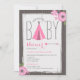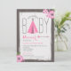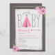En modern barnduschinbjudan med en illustration av en rosa chevrontipi, en pil och blommor. Bakgrunden är virkesinspirerad. Anpassa texten.
