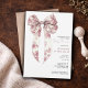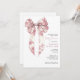 En rosa toile coquette band erbjuda flicka baby shower inbjudan med en elegant vintageinspirerad illustration av en rosett som ger en mjuk romantisk touch till firandet. Den känsliga bandkonsten i kombination med klassisk typografi skapar en graciös look som känns både tidlös och stilren för att välkomna en babyflicka. Inspirerad av den populära coquette-estetiken och traditionella toile-mönster, har denna design en delikat arvegenskap som fungerar vackert för charmerande baby shower-firanden. Ett underbart val för värdar som planerar en baby shower för flicka, vintageinspirerat firande eller sött rosa firande där feminin elegans och klassisk saga stil möts. Tillgänglig i tryckt version, som digital nedladdning eller båda.