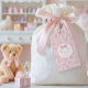 Perfekt för en coquette-inspirerad flicka första födelsedagsfesten. Personlig med namn och rosa båge.