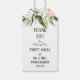 "Tack för att ni delar vår första måltid som Mr. och Mrs." = Denna förtjusande märkre som gjorts med olika typsnitt stilar och som fyllts med en bukett av tropiska blommor och mörk grönt löv är ett sött sätt att säga tack till gästerna när de sätter sig ner på middag. Varje rad kan vara personlig åt dig.