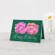 Två fantastiska rosa tulip-blommor bildar en vacker blommigt bukett mot mörk grönt bakgrund i färg. Hälsning-födelsedagstexten användor ett attraktivt typsnitt för skript. Blommorna täcker framsidan av detta kort som kan användas som ett tackkort, ett födelsedagskort eller något annat kort som du väljer. Anpassa den med din text och/eller bilder för att göra den till en sorts!