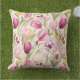 Denna utomhusaccentkudde visas med ett vackert tryck av rosa tulpaner.