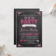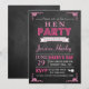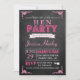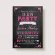 Gör dig redo för en sista rolig natt i stil med dessa glamorösa tavla- och neon-hen party-inbjudningar! Designen har en modern svart tavla-bakgrund som får den livfulla varma rosa neon-typografin att sticka ut. Texten innehåller ett roligt "prickmönster" för att efterlikna en upplyst marquee-skylt och lägger till ett extra lager av glitter och gnista. Med sina eleganta vintage hörnfiligrer och djärva rosa färger sätter denna inbjudan tonen för en rolig och sofistikerad natt ut. Det är den perfekta inbjudan för en cocktail hen-fest, en "natt på stan" eller en sofistikerad barfest. All text, inklusive brudens namn, datum, baradress och RSVP-information, är helt anpassningsbar för att passa