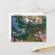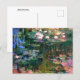 Ett vykort för brans konst med landskapsmålning, Vatten Lilies (1917) av Claude Monet (1840-1926). En liten damm i vatten med lila dynor av vita blommor och rosa som reflekterar utanför vatten, inspirerad av hans egna vatten-trädgårdar i Giverny, Frankrike.