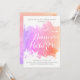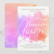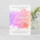 Modern abstrakt rosa vattenfärg stänk med svält och fiskmåsar bröllop inbjudningskort för möhippan. Den visar en handmålad vattenfärg stänk med struktur i ton av rosa, lila och korall, två stjärnfiskar och fiskmåsar i vitt och text i vitt och grått.