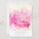 Rosa vattenfärg, vitt löv och kalligringsinbjudan till kalligrfibröllop med guld-konetti.