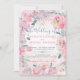 Blommigt chic bröllopsinbjudan med rosa handmålad skisserad peony ro med havets blå blad och blommar gräns på tvättat ljus rosa bakgrund. — inbjudan lämpar sig för vår sommarromantik, rustik eller trädgård utomhus vid ceremoni och mottagningar i bröllop.