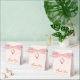 Meddelandet Tack är skrivet i den nedre delen, med ett elegant roségult skrivstil, tillfället och datumet är skrivna med versaler under. Bakgrunden är rosa.