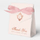 En rosa presentask för ett bröllop med rosa och roséguld bröllopsfärger. På klaffen finns en roséguld vapensköld med ett monogram i.