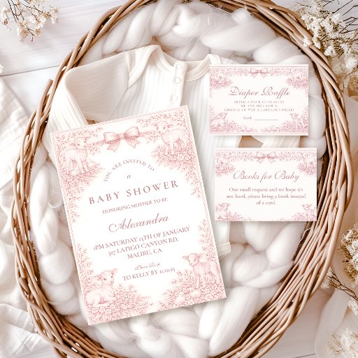 Rosa Vintage Toile Lamm Bebis Shower Inbjudningar