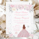 Denna eleganta och glamourösa vinter-sweet sixteen-födelsedagsinbjudan visar en vacker prinsessa med rödbrunt hår och ljus hy i en rosa klänning. Texten kombinerar handskriven skrift och moderna sans serif-teckensnitt för en klassisk och sofistikerad look. De blomsterarrangemang, snöflingor och silverkonfetti skapar den perfekta blandningen av rustik och chic.