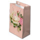 En liten presentväska med blommigt bukett med rosor med vita och rosa blommor. Bakgrund är rosa med ett blommönster. Söt och elegant.