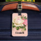 Ett bagagemärke med blommigt bukett med rosor med vita och rosa blommor. Bakgrund är rosa med ett blommönster. Söt och elegant.