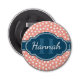 Snyggt, trendig ljus rosa och vit mönster i bakgrunden, med en mörk blått etikett med anpassade namn och monogrammall.