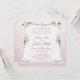 En chuppah-bröllopsinbjudan med en rosa-ombre-bakgrund med en ren vit chuppah med ljus, gräs, eukalyptus och olivben från gren med vita anemoner.