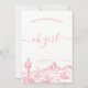 Rosa Wilderness Äventyr Begins Baby Shower Desert wilderness Tema: äventyr startar flickornas babyduschinbjudan med ett blått ökenscen och ett dekorativt kalligrafiskt rubrikteckensnitt. Övrig färg finns tillgänglig i lagret.