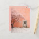 Romantisk minimal japansk vinterscen med en rosa blommar träd i snö och en gammal russindörr