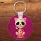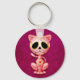 Denna förtjusande rosa kattens utformning är dekorerad med snurrar och punkt mönster. Blompedaler omger det rena svarta öga i Day of the dead-döskallarnas tradition. Katten ligger sitta ner och tittar fram med svan i bakgrunden. Det överdimensionerade huvudet sitter på en liten kropp som skapar en lekfull, tecknad som utseende. En fempunktsstjärna sitter i mitten i kattens pannan medan ett ljust rött hjärta och gult visas i bröstets centrum. En skugga faller över den vibrerande rosan bakgrund skapar att designen verkar flyta precis ovanför yta i den här nyckelkedjan. Den här söta lilla katten är en roligt- och snyggt-design som inspireras av de vackra mönster av Day of the dead-döskallar.