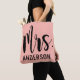 Gör ett statement som den nya "Mrs." med denna snygga tote som har fet svart borst-kalligrafi på en söt rosabränd bakgrund med ett personligt efternamn i rena blockbokstäver. En stilren monogrampresent perfekt för smekmånad, bröllopsfest eller vardaglig användning som nygift. Efternamnet är helt anpassningsbart.