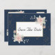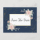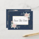 Den botaniska bröllop spara datum-vykortsdesignen i eleganten har rosa, matade vattenfärgblommor i en marin blå bakgrund plus en sofistikerad uppsättning typsnitt. Visa samlingslänken på den här sidan för mer inspiration.