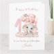 Tvätt kort med en fin elefantflicka, stort nummer ett, pumpor och ballonger i mjuk rosa- och mörk-beige-skuggor för fallets första födelsedag i flicka. Anpassa det här kortet enkelt med din egen text. - Kate Eden Art