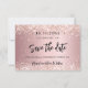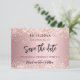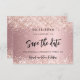 A Spara datumkortet för en Sweet 16, 16th (eller någon ålder) födelsedagsfest. En metallisk rosa tittar bakgrund som dekoreras med ro faux glitter damm från guld. Anpassa och lägg till datum och namn/ålder. Texten: Spara datumet skrivs med ett stort trendig-handskript i stil med dekortecken.