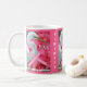 Oktober är bröstcancermånaden, men detta viktiga subjekt kan bli ihågkommet hela året med detta Mugg av ZoeSPEAK. I originalet visas en vit fågel, en underbar gult, framför rosa blommor, vattendrag. Fågeln har en lång gult och en nacke har böjts som brev S. Gläret bär ett rosa band runt hennes nacke, en påminnelse om vikten av medvetenhet om bröstcancer. Konstruktionen upprepas runt mugg under rosa. Mellan fotona finns en text som säger ÅTERKOM, men den kan ändras eller raderas till kostym efter dina behov.