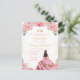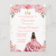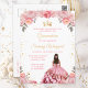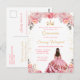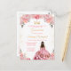 Denna eleganta och glamourösa Quinceañera-födelsedagsinbjudan visar en vacker prinsessa med mörkt hår i en rosapink balklänning. Texten kombinerar handskriven skrift och moderna sans serif-typsnitt för en klassisk och sofistikerad look. De blomsterarrangemang och guldconfetti skapar den perfekta blandningen av rustik och chic.