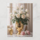 Rosbukett i guldfärgad vas i solljus för alla till vykort