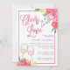 Eleganten och det moderna inbjudningskort för möhippan för vin älskare har genomskinliga, färgstarka vattenfärgade blommor och två klinkglas av rosé vin. "Cheers to Kärlek" visas i handskrivet skript av rosa. Anpassa med din möhippa-information eleganten blue-grått-bokstäver. Kort på baksidan till fuchsia rosa och vitt rand.