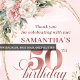 Commemorate your 50th birthday celebration with our elegant Thank You Card. Adorned with a beautiful blush pink rose and eucalyptus design framed in a luxurious gold border, this card conveys your heartfelt gratitude to all your guests. The classic, refined aesthetic makes it the perfect way to express your appreciation for their presence on your special day. Whether you're sending it by mail or handing it out at the party, this Thank You Card will leave a lasting impression and show your guests how much their support means to you. Celebrate this milestone in style with our thoughtfully crafted 50th birthday Thank You Card.