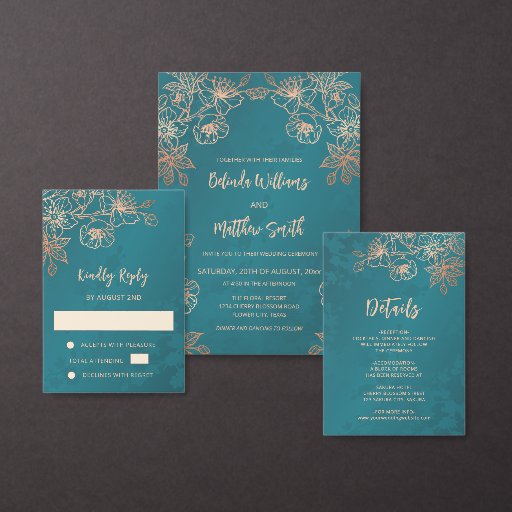 Rose gold floral line art cherry blossoms on a shimmering teal background. Matching wedding invitation available.