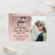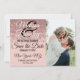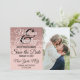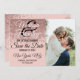Glamourösa, snygga och eleganta falska tryckta gnistrande rose gold glitter på en rosa bakgrund, Spara-datum bröllopskort. Denna klassiska och sofistikerade design är perfekt för det trendiga och stiliga paret som gifter sig. Anpassa med ditt eget meddelande på framsidan samt en anpassad monogram-initial på baksidan. Allt foto utskriftsdesign.