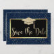 Elegant guldglitter examenshatt och konfetti på en marinblå bakgrund.