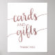 Denna affisch med roséguld kort och presenter är perfekt för ett enkelt bröllop eller brudvisning. Designen har vacker falsk roséguld folie och modern kalligrafi. Textraden längst ner på skylten kan anpassas med datumet, brudens och brudgummens namn eller ett kort meddelande som "Tack".