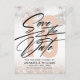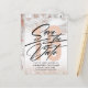 Modern, trendig Sweet 16 Födelsedag Spara Datumet vykort. Designen har rose gold nummer 16 på en rose gold marmorerad och glitterbakgrund, typsnittsmanus ''spara datumet'' och detaljer i fet stil.