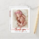Simple Modern Elegant Calligraphy Rose Gold Script Photo Newborn Baby Tackyou Postcard. Har en vacker "tack"-text i en kursiv, handskriven kalligrafi som byter ut svanesskript i faux rose gold-foil (eller blush rosa folie). På baksidan av det personliga meddelandet och bakom all text finns det ett foto som du väljer med ett vitt överlägg. Underbar för flicka. Enkel att anpassa med ditt baby-foto och din information.