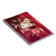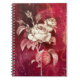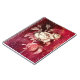 A delicate monochrome bouquet of roses is set against a vibrant red background, creating a striking contrast. The composition is accented with speckled textures, adding depth to the floral imagery.