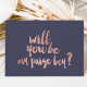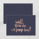 En modern, originell och chic borste hand lettering typografi i falskt roséguld blad kommer du att bli min paige boy-kort på en elegant och enkel anpassningsbar midnatt blå bakgrund
