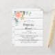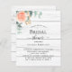 Rustik vit trädgård som bakgrund. Dekorerad med en roséguld och rosafärgad blommig, ros och gröna akvarellmålade eukalyptusblad, kvistar, grönska och en falsk guldkvist. Anpassa och lägg till namnet på den blivande bruden och festdetaljer.