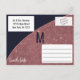 Elegant, chic och modern falskt tryckt roséguld glitter och roséguld folie cirkulär färgblockering urklipp på marinblå och falskt roséguld borste skript text, Spara-datum bröllop Postkort. Denna klassiska och sofistikerade design är perfekt för det trendiga och stiliga brudparet. Personalisera med ditt eget meddelande på framsidan samt en anpassad monogram initial på baksidan. Allt foto tryck design.