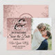 Glamourös, chic och elegant falskt tryckt gnistrande roséguld glitter på en rosa bakgrund, Save-the-Date bröllopskort. Denna klassiska och sofistikerade design är perfekt för det trendiga och stiliga paret som gifter sig. Personifiera med ditt eget meddelande på framsidan samt en anpassad monograminitial på baksidan. Alla fototryckdesign.
