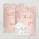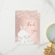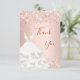En roséguld, rosa gradientbakgrund. Med falskt glitter, gnistrande och en klänning. På framsidan en stor handskriven text och texten: Tack.