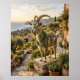 A spirited rosemary goat stands confidently on a Mediterranean terrace where rustic charm meets herbal beauty. Realistic goat anatomy blends with rosemary sprigs, aromatic leaves, rugged textures, and elegant botanical accents across the coat, beard, shoulders, and horn bases. Stone walls, olive trees, warm sunset light, distant sea views, and hillside village depth create a welcoming upscale countryside mood. This premium fantasy farm design adds character to kitchens, rustic homes, patios, or gift collections. Perfect for goat lovers, herb garden fans, and farmhouse decor themes.