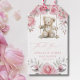 Förpacka dina presenter med en liten björnknuff! Denna söta etikett har en fluffig teddybjörn, mjuka akvarellblommor och ett varmt ”tack” till gästerna på baby shower. En förtjusande detalj som tillför charm och kärlek till varje genomtänkt present eller godispåse.