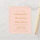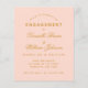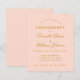En enkel inbjudan till en förlovningsfest med en modern färg: rosenskift. Den har endast guldbokstäver på rosenskift bakgrund. Namnen är skrivna med en elegant kalligrafisk stil, resten med versaler. den första raden är en välvd text.