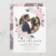Vår rosenträdgårdssamling har ömma rosor i rosafärgen med blad i gulddekor på lila, rosa och dammig blå bakgrund. Vacker, ömmande lövverk och blommor gör denna samling idealisk för vår- eller sommarbröllop. Detta kort för att spara datum har en blomsterkrans med guldbård som innesluter ert foto i kombination med elegant typsnitt för all information som lätt kan anpassas. Om ni önskar att det anpassas ytterligare med speciella färger är ni välkomna att kontakta mig via min butik.