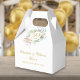 Elegant blomsterlåda för 50-års gyllene bröllopsjubileum med vacker rosgirland och personliga namn och datum i chic guldtypografi. Du kan också anpassa med ditt eget tackmeddelande under locket. Ett perfekt sätt att tacka dina gäster! Designad av Thisisnotme©