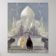 Vintage färg illustration för bok "Gamla Fransk Fairy Tales". Virginia Sterrett illustrator. Illustration skildrar Rosette och prinsen med sagans slott i bakgrunden.